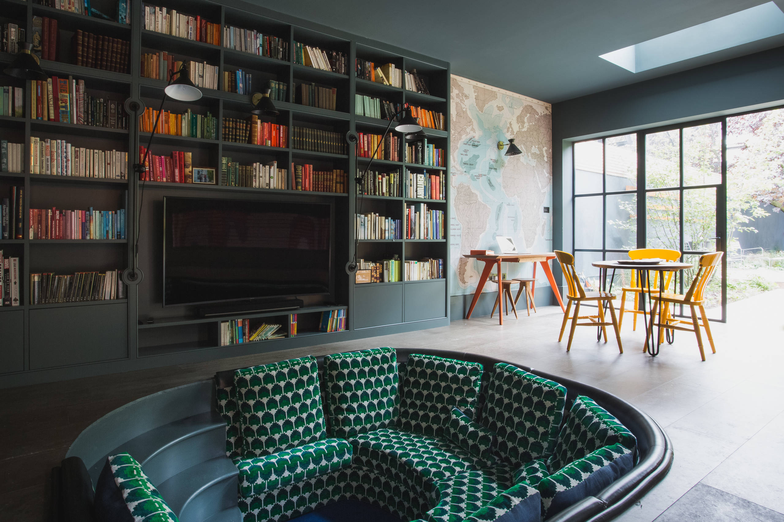 This dark shade of grey-green also works well – as deep colours often do – as a foil for bright accents. Here, the spines of the books stand out nicely, while the TV screen recedes.