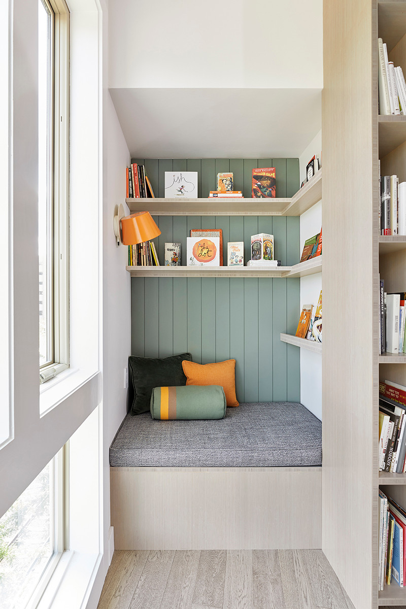 In this home, designed by Dyer Studio, a soft shade of sage has been used sparingly as the backdrop for a reading nook.
