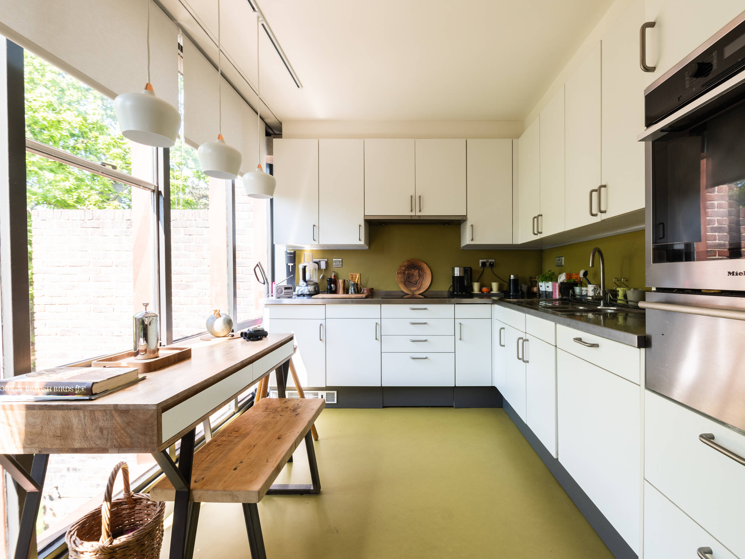 Matching the flooring to the splashback is a design-confident way to use this distinctive olive green.