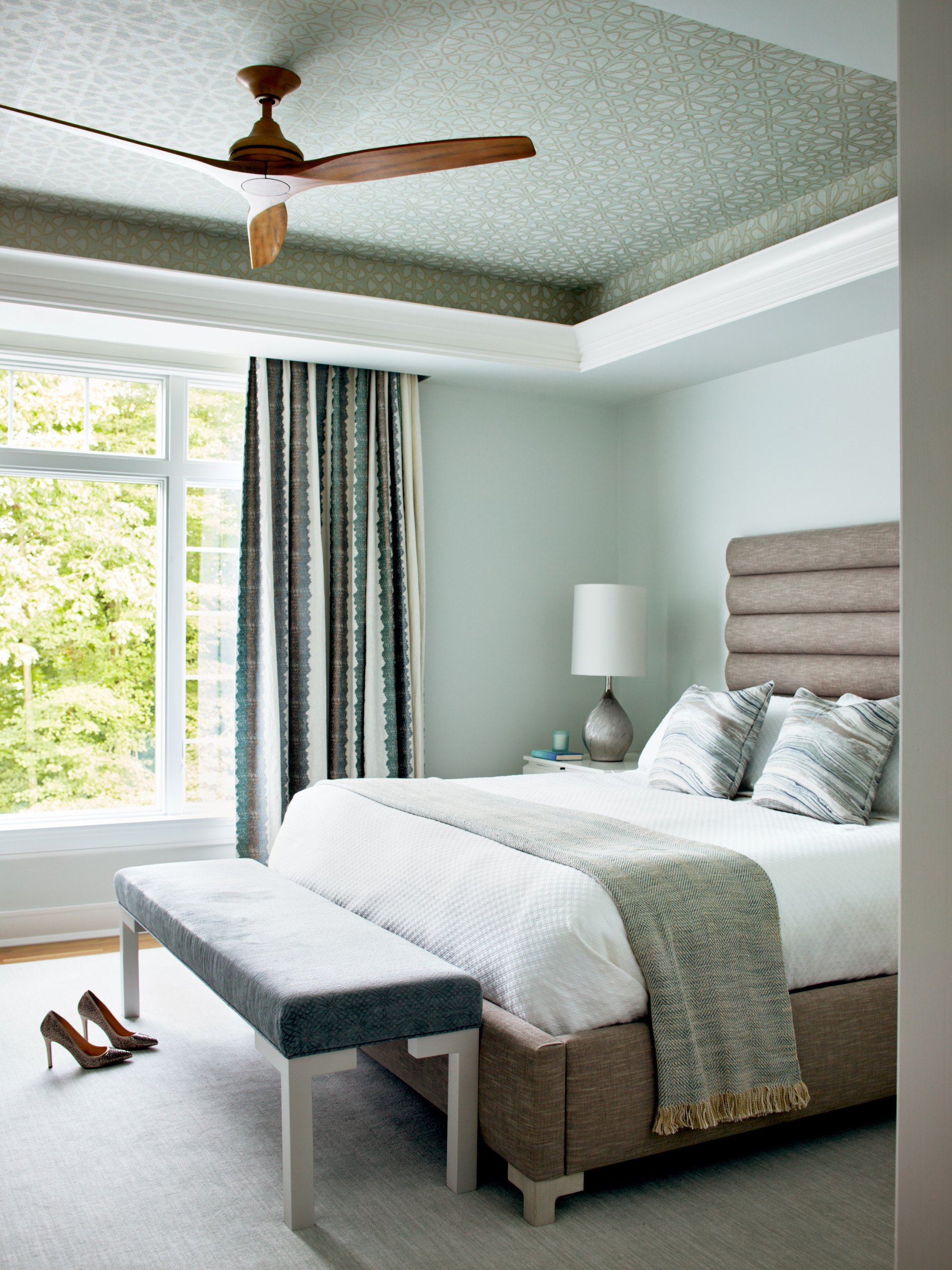 This room by Lorraine Levinson Interior Design does it beautifully by combining a number of complementary soft greens that cocoon the room in calm. Check out the fern-coloured wallpaper ceiling, too.