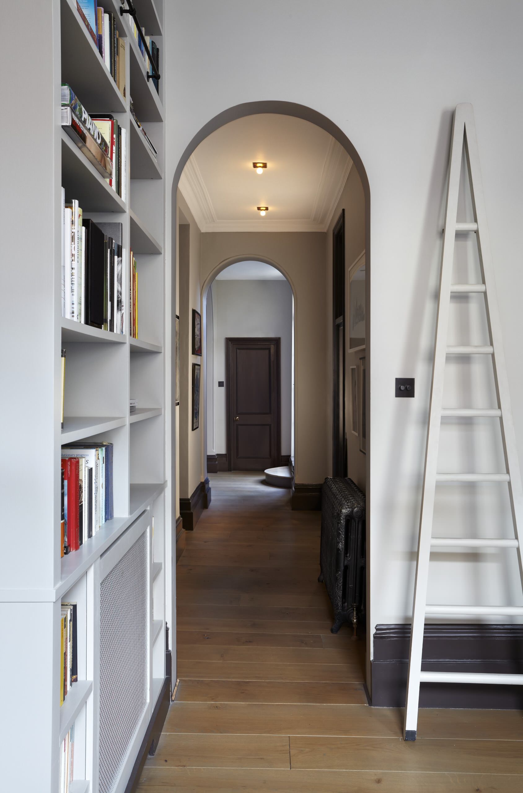 Strategically placed mirrors are a great choice for small rooms, as they create the optical illusion of a bigger space, as well as boosting light. This mirror reflects a busy bookcase, visually widening the hallway.