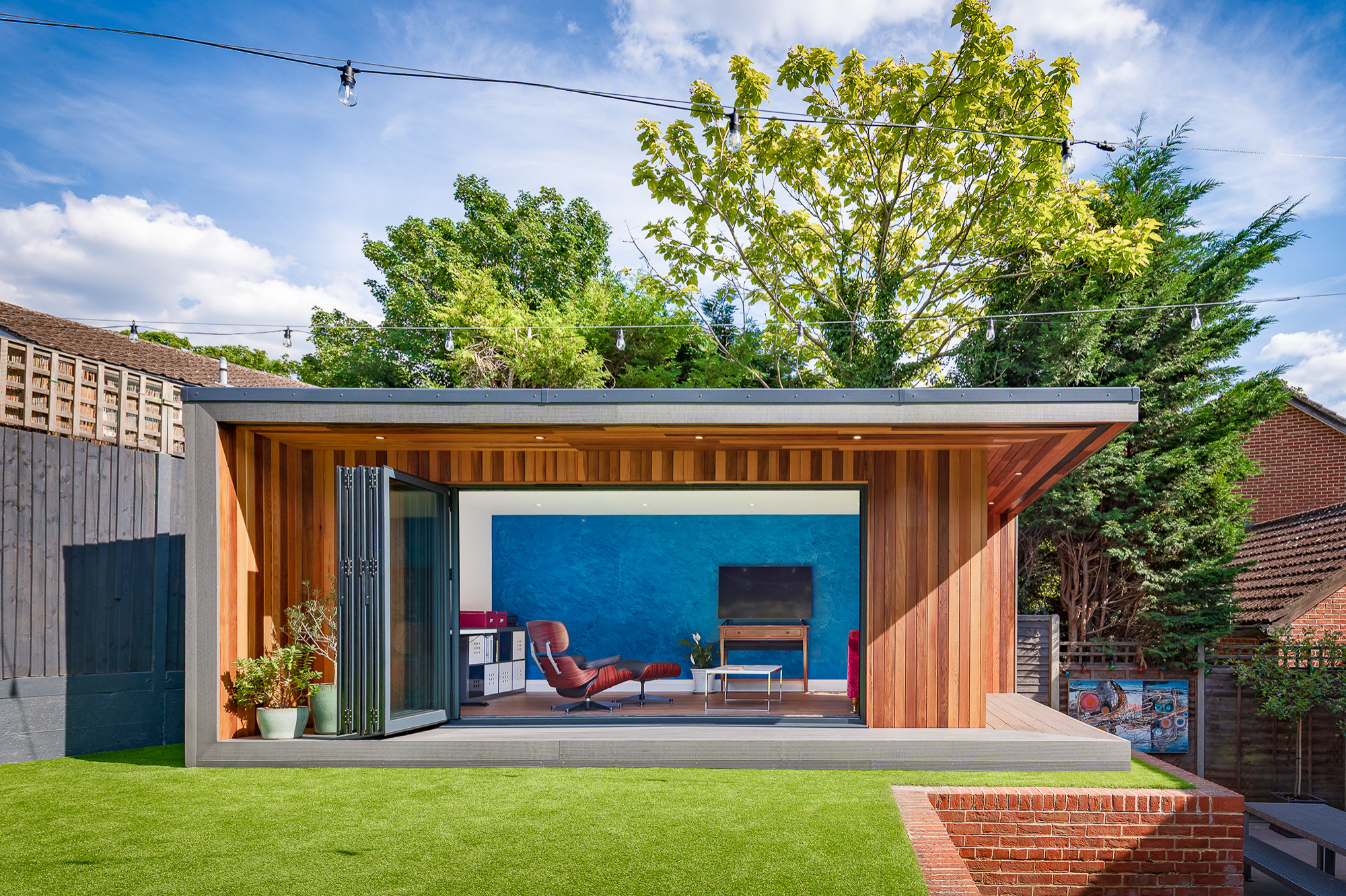 The dark wood cladding and clean white walls give a modern look, while large bifolding doors onto its own patio blend the indoors and outdoors beautifully.