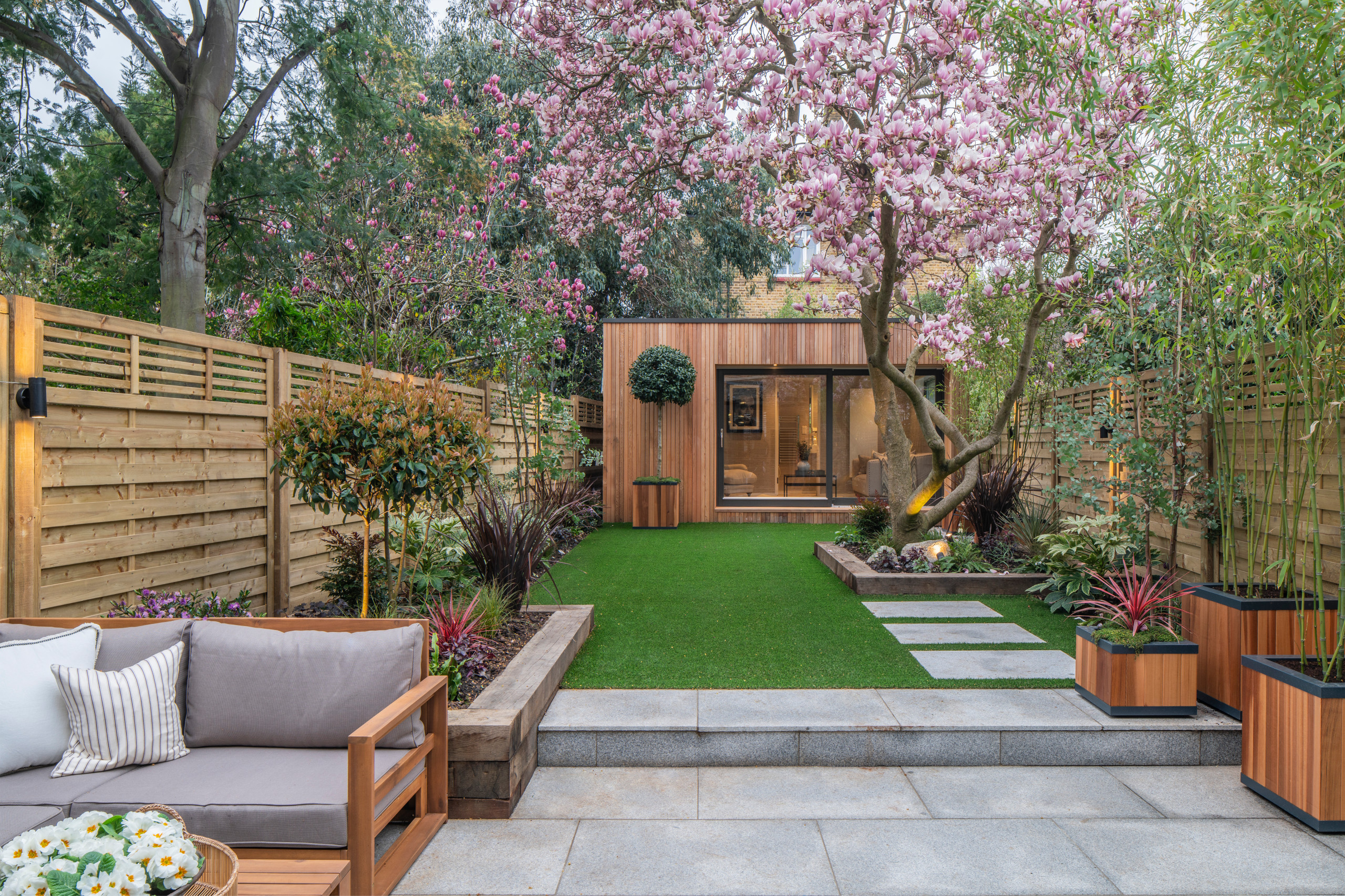 Repeating motifs or materials to pull an outhouse into the rest of the garden will make it feel like an integrated part of the design, rather than a feature added on separately.