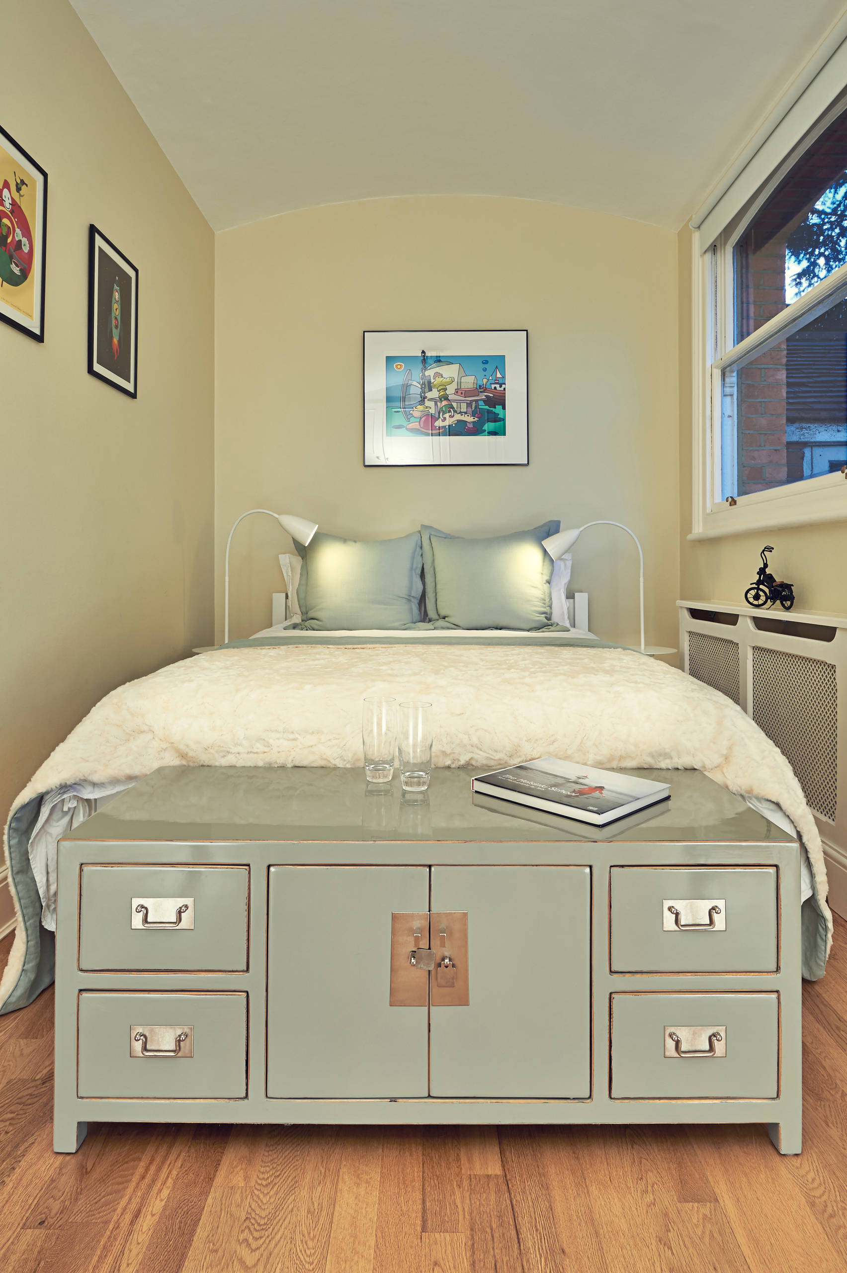 This narrow room could have been storage-light but for the end-of-bed cupboard and drawer combination. Widthways, it occupies almost the same area as the bed to maximise stash space.