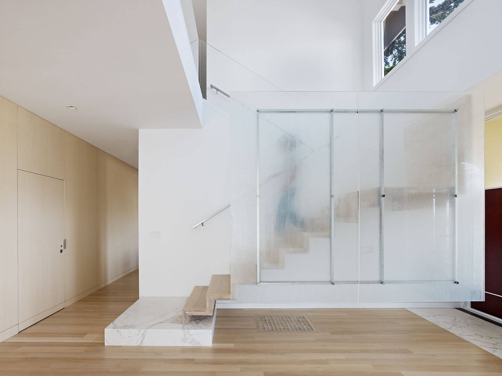 This landing slab could have gone completely unnoticed if it were the same material as the rest of the staircase. But in this smooth, white marble, it draws attention to and defines the area where the room and staircase meet.