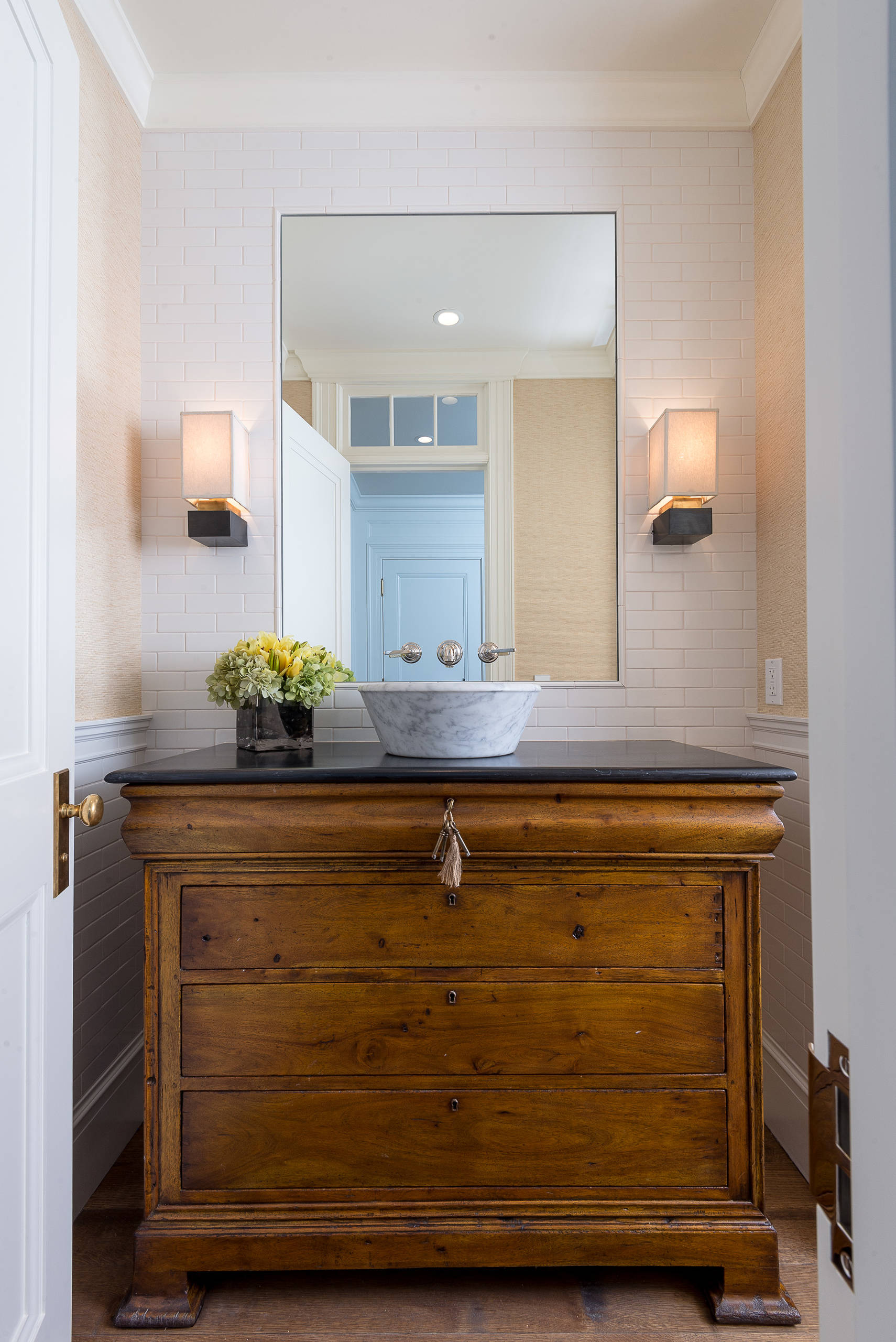 A marble basin will add a sense of luxury to any bathroom. This beautifully veined countertop bowl forms the centrepiece in this room, and it would look equally at home on a rustic raw wood table or plain white vanity unit as it does on this imposing chest of drawers.