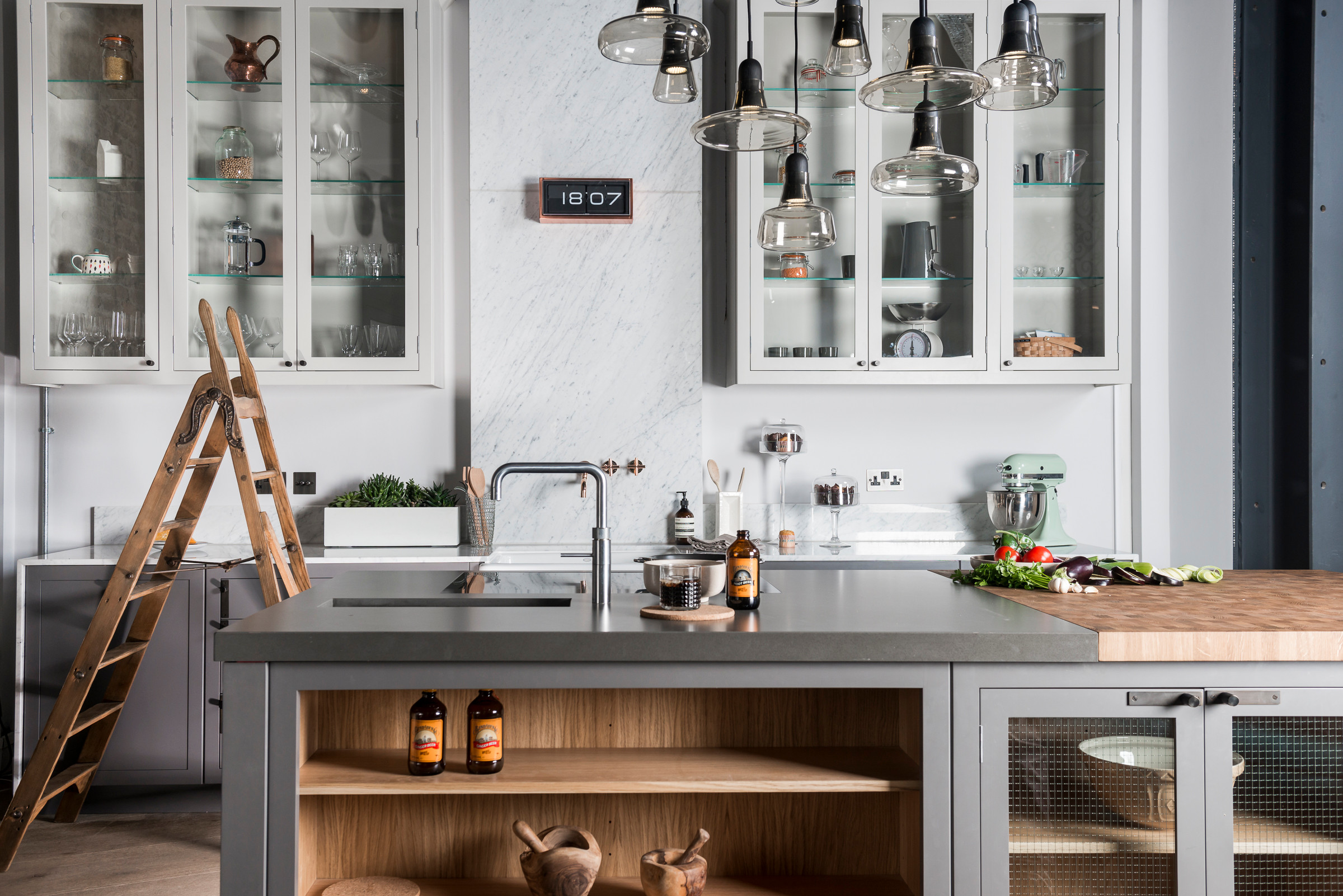 Make a feature of a small stretch of marble splashback by turning it on its end. This section, which runs up between glass-fronted units, acts as a focal point in the kitchen. Here, it’s a continuation of the marble worktop, but it could work just as well with a plain white worktop with marble upstands along the back to link it in.