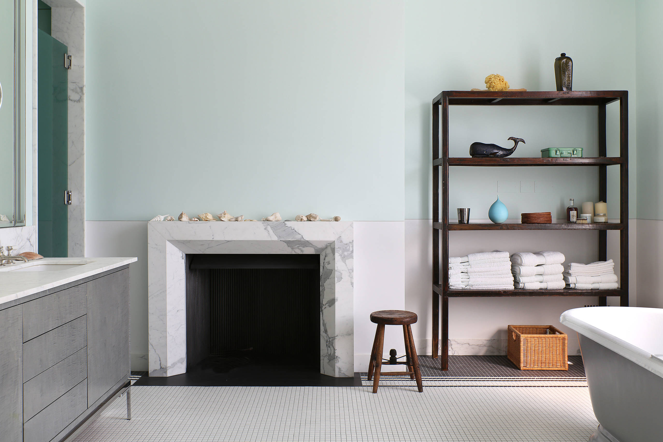 Marble fire surrounds are nothing new, but this minimalist one just goes to show that traditional pieces can be modernised while retaining their character. Here, the marble continues around the room in the skirting board and doorjamb – an idea that would work equally well without a fireplace to introduce a subtle shot of marble to a bathroom.