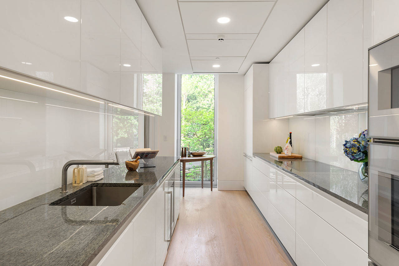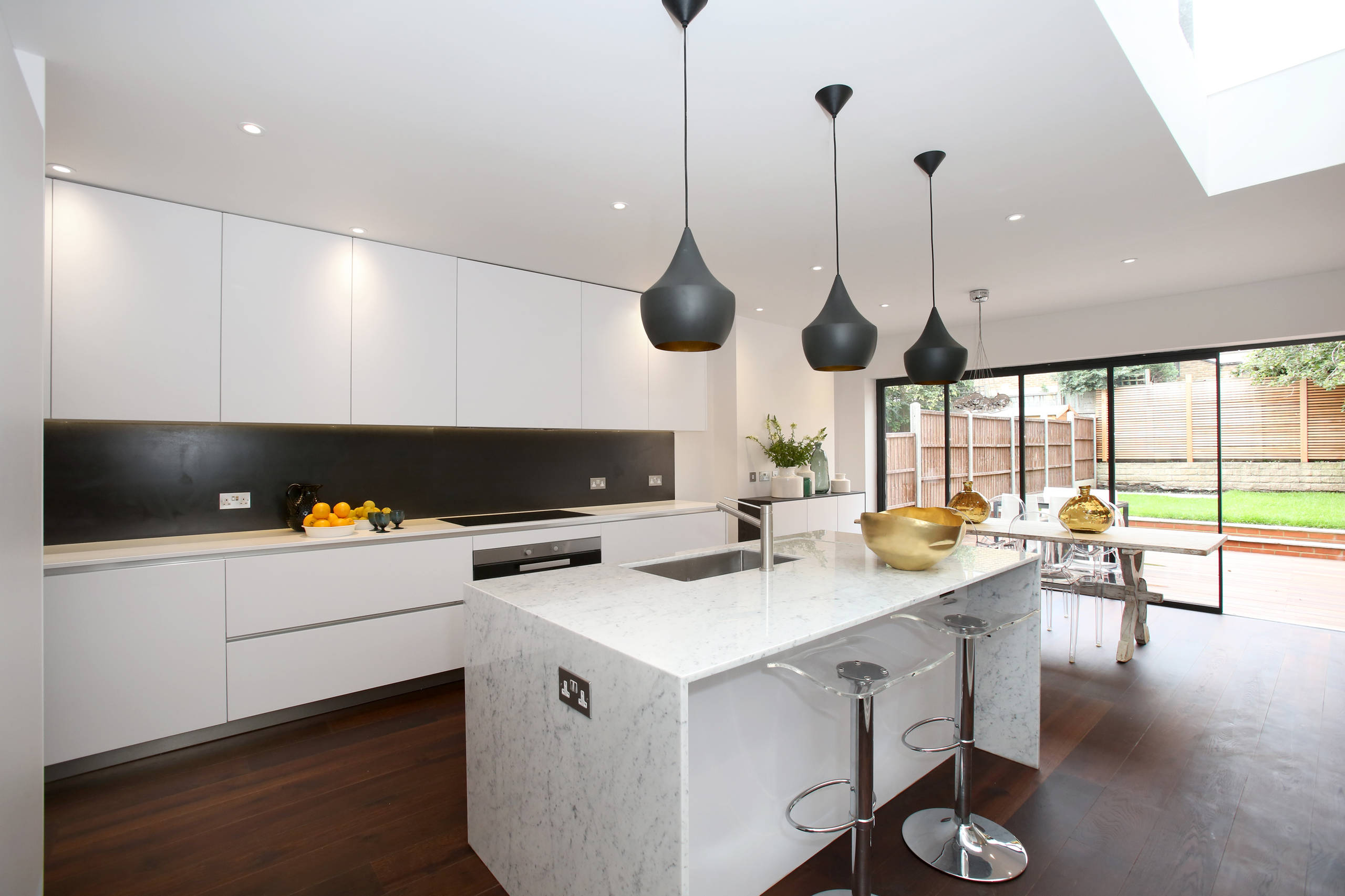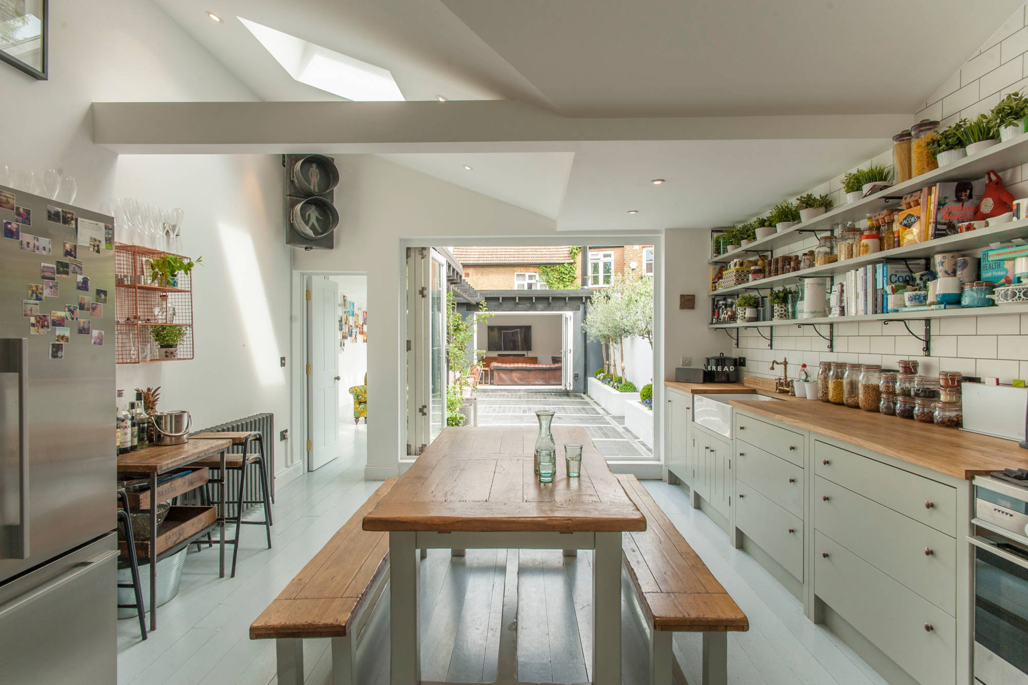 It’s becoming increasingly popular to forgo wall storage entirely. Kitchens like this one are fitted with just a row of base units and nothing on top. It looks light and airy and gives a feeling of space and movement.