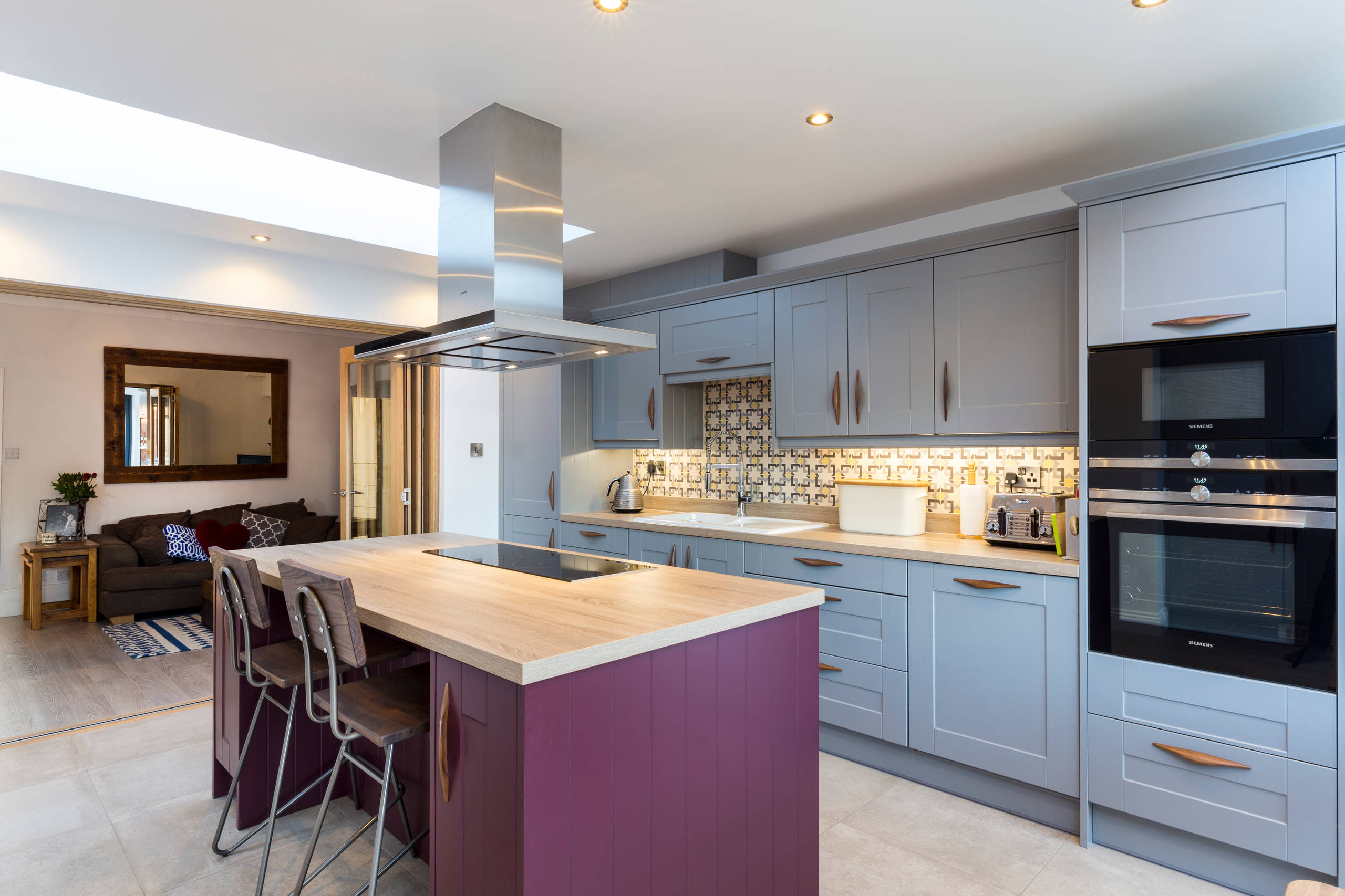 If your kitchen is full of cupboards and drawers, it might feel as if the space is filled with the same colour. Combat this by adding another shade into the mix. Here, a purple island prevents the blue from overpowering the room.