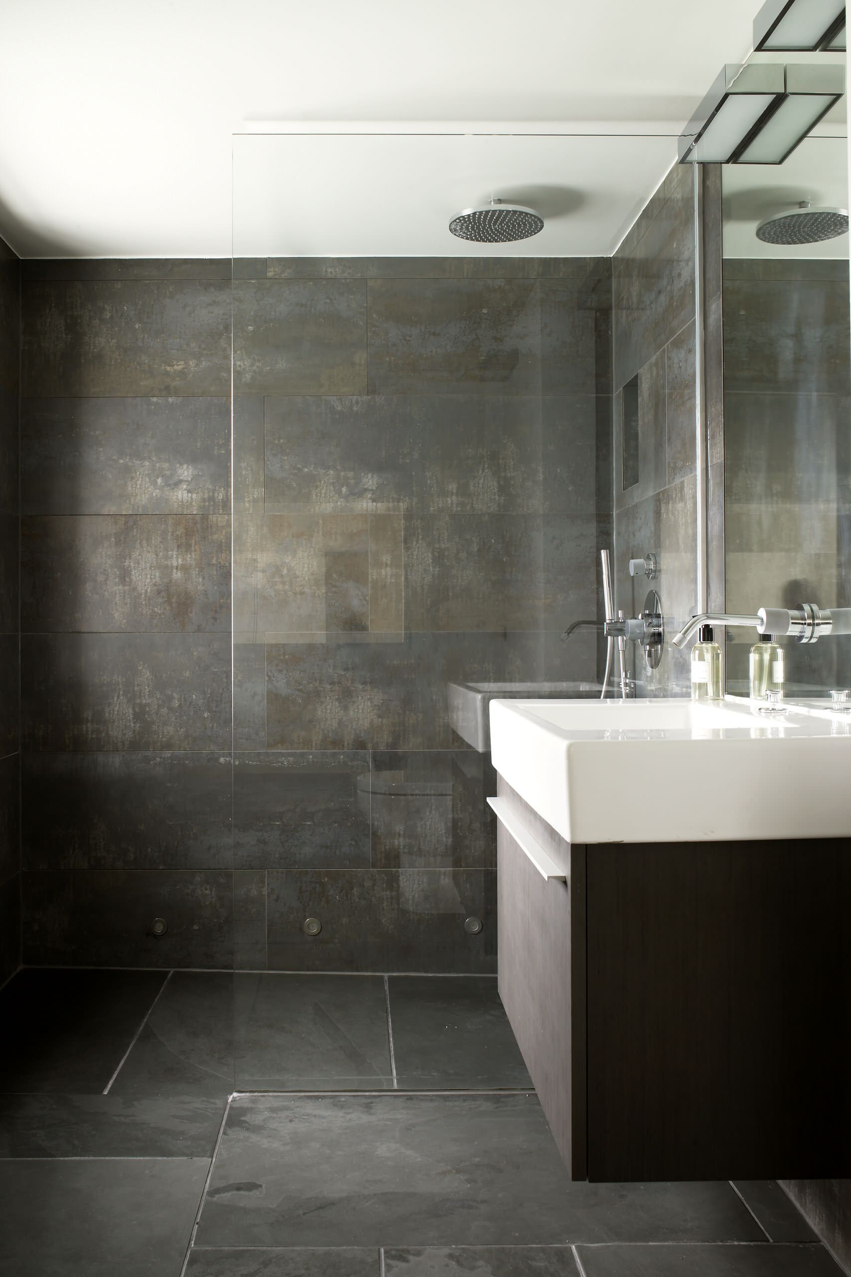 Lighting is key in a small wet room, especially when surfaces are dark and dramatic. Choose a mix of ceiling lights and wall fixtures that create a wash of light for subtle light levels that produce a warm, cocooning effect.