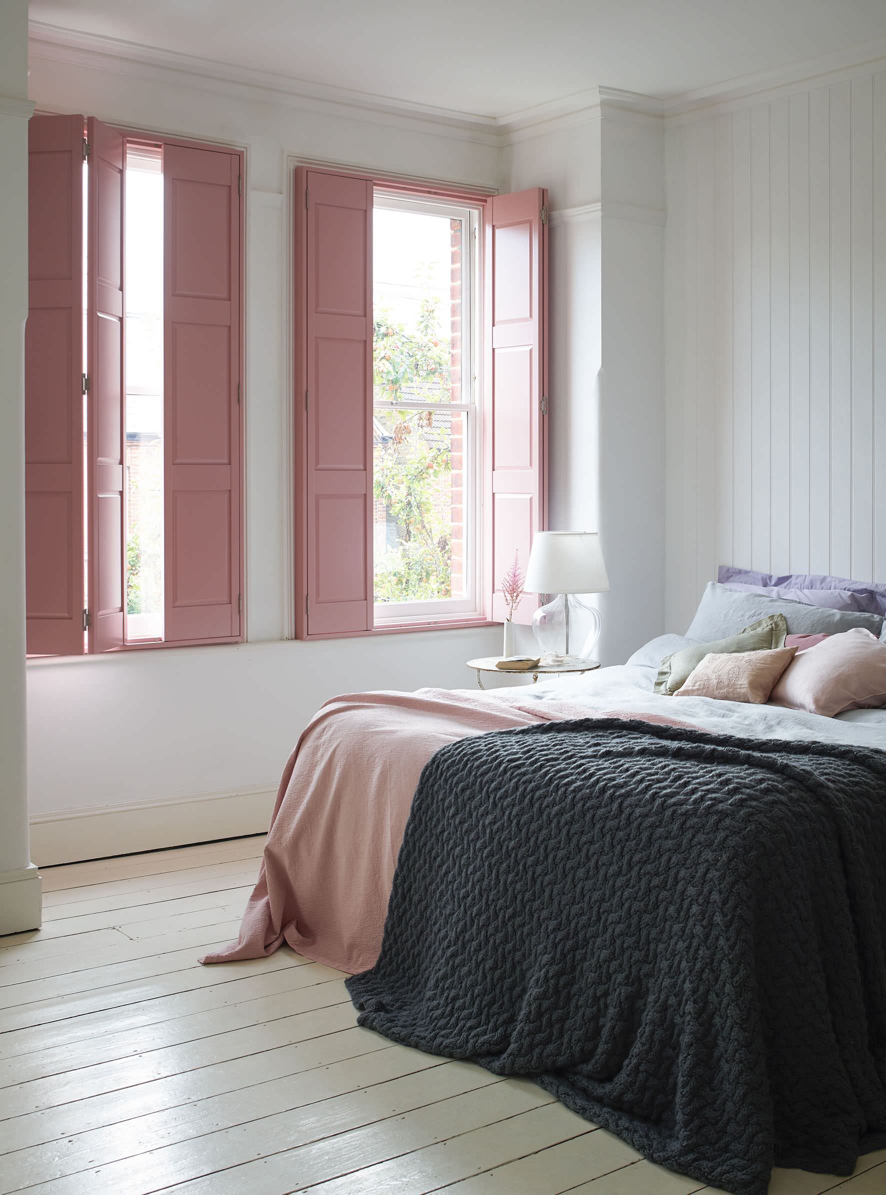 If you like the idea of creating a cocoon-like retreat in the bedroom, you could try a really dark shade, such as this inky grey. To stop the room veering into moody gothic territory, pretty natural linens in pale pinks and a coral stool provide the necessary contrast and ensure the overall effect is fresh and contemporary.