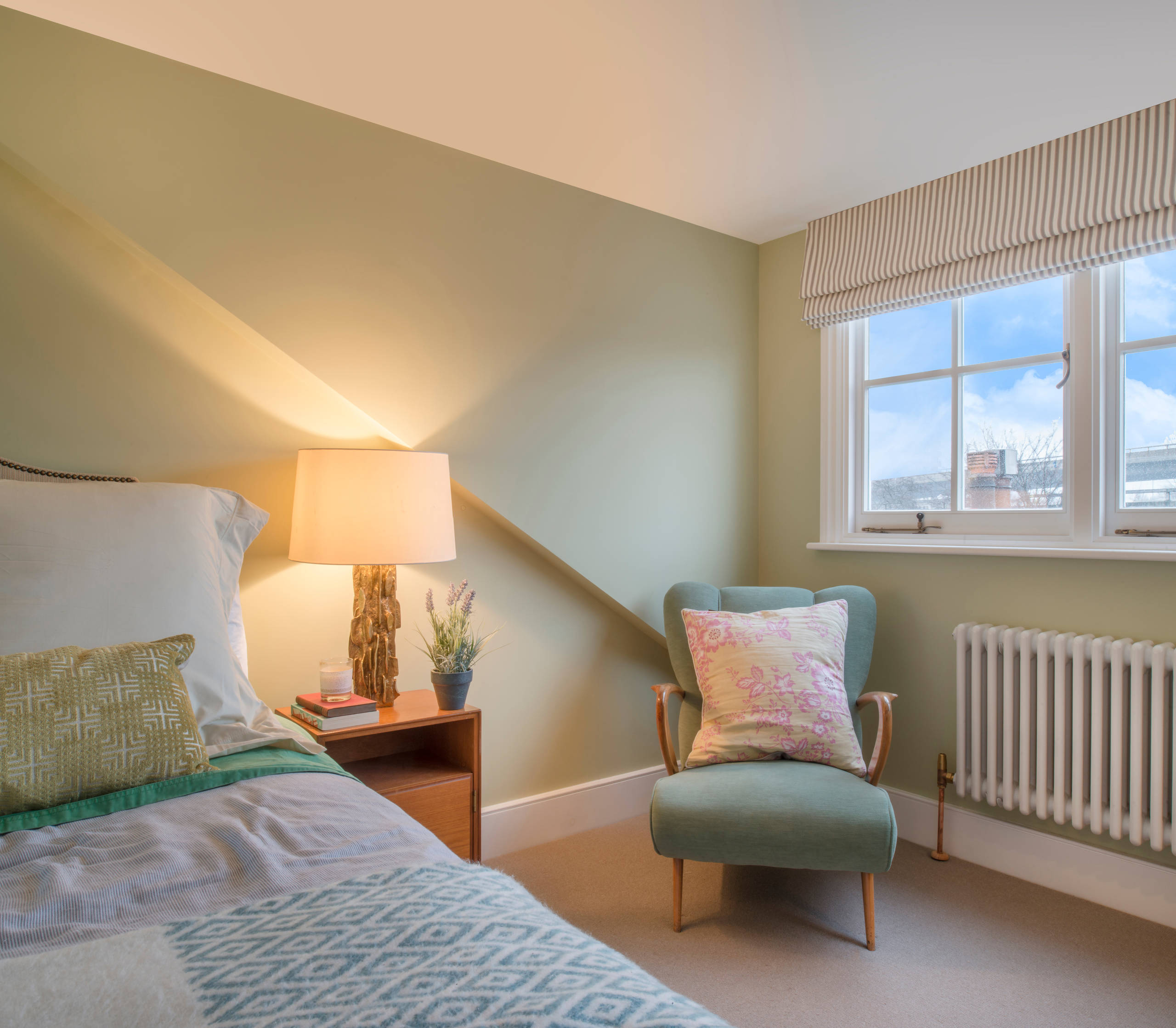 For a soft, fresh look, a gentle pale-green shade is a good option. With its echoes of the natural world, green is very soothing, while simple furniture and unfussy blinds at the window here help to keep the space simple and restful.