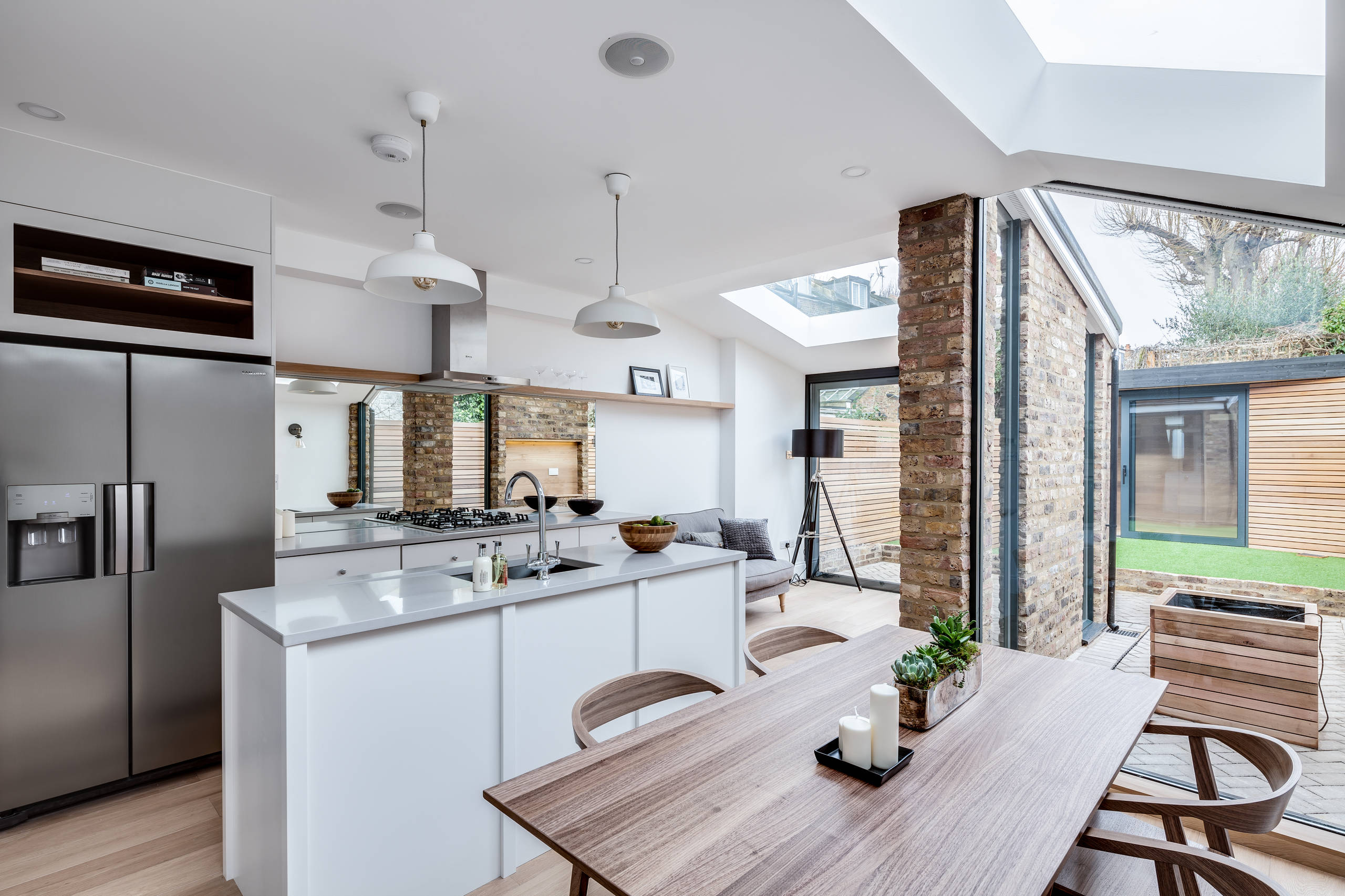 Structural pillars are a good example of this; these support posts are often present in extended kitchens as they can expensive to remove, but they’re often bulky and prominent. In this kitchen, the pillar has been clad in mirror, which effectively makes it vanish, as all you see are the reflections, not the structure itself. And while cleverly disguising the pillar, the mirror also turns it into a contemporary feature.