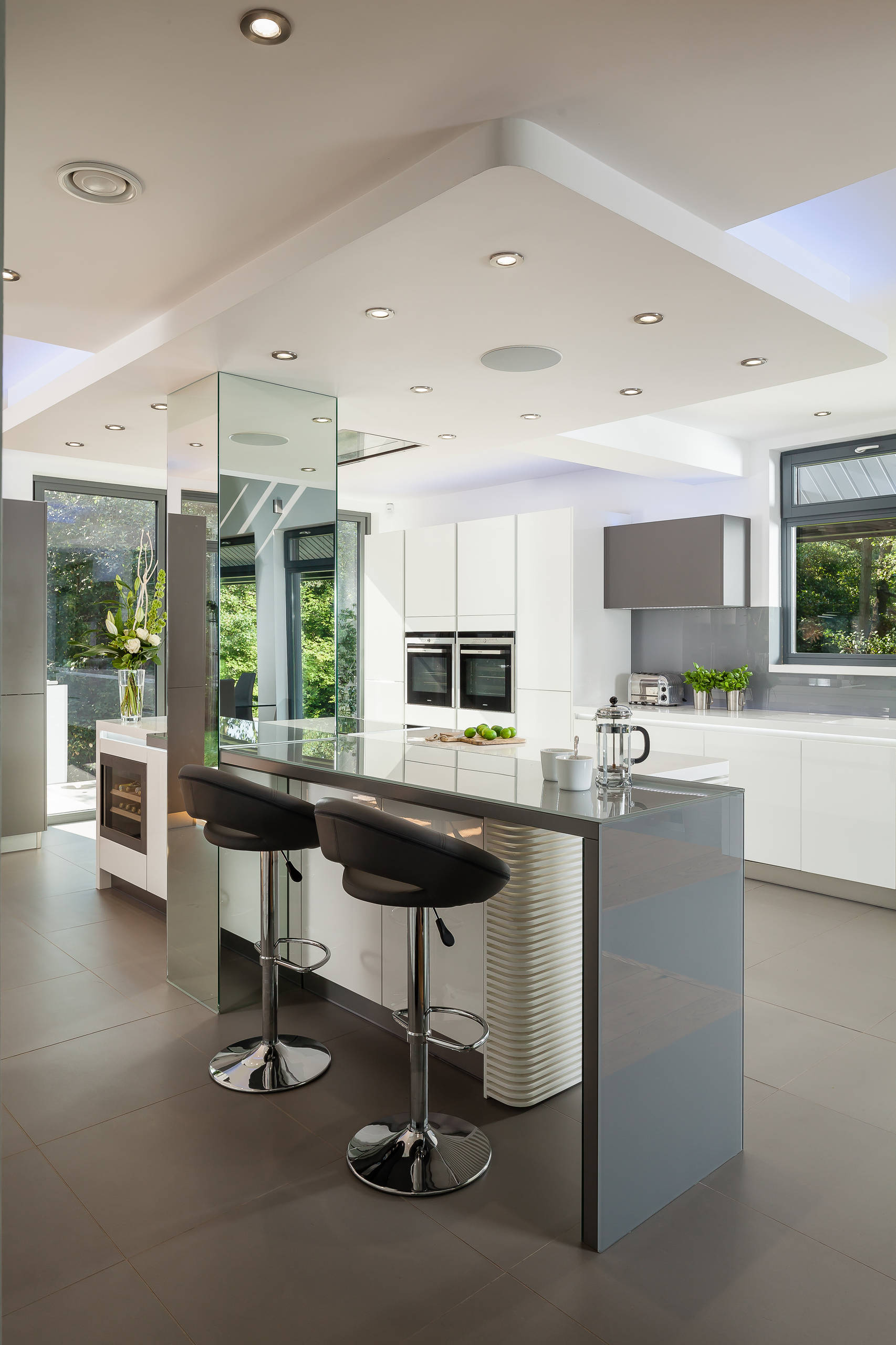 Another option for unit doors is coloured glass. This can be a good alternative to gloss cabinet doors, and provides a surface with even deeper reflective properties, as shown here.