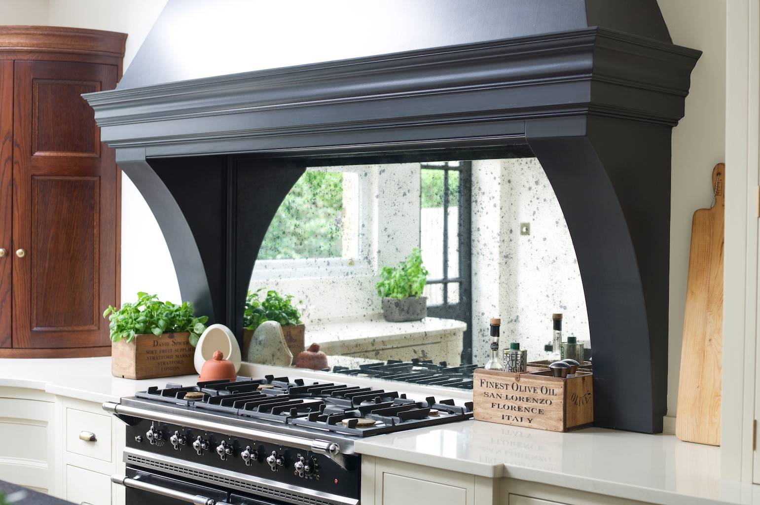 Clever positioning of a mirror can boost your kitchen’s design in several ways. For example, locating a mirrored splashback behind a hob (as pictured) will let you easily keep an eye on small children or continue to chat to friends, without having to turn around while cooking.