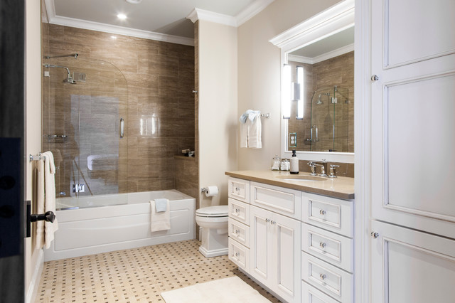 Photo of a medium sized traditional family bathroom in Burlington with a submerged sink, recessed-panel cabinets, beige cabinets, engineered stone worktops, beige tiles and beige walls. — Houzz