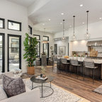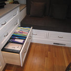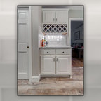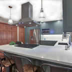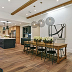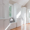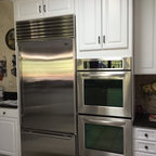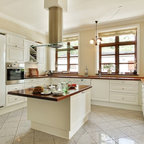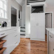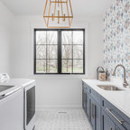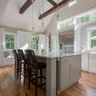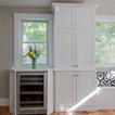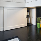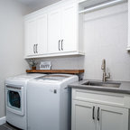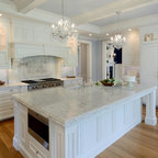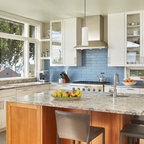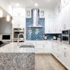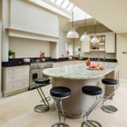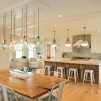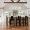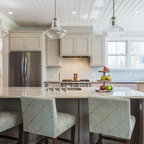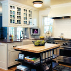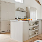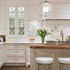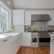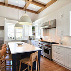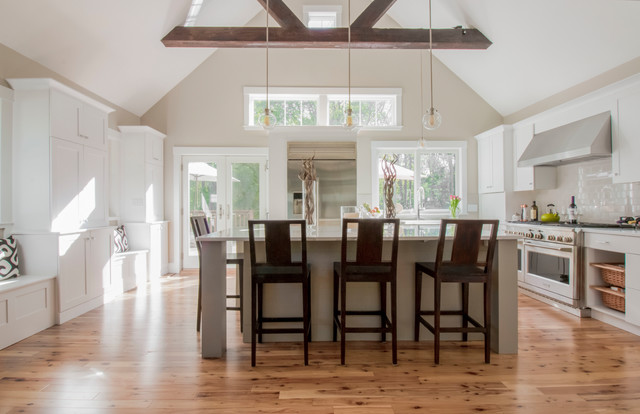 Photo of a large classic l-shaped kitchen/diner in Boston with a belfast sink, shaker cabinets, white cabinets, engineered stone countertops, grey splashback, metro tiled splashback, stainless steel appliances, light hardwood flooring and an island. — Houzz