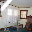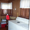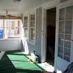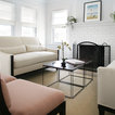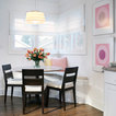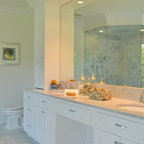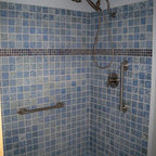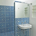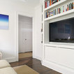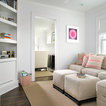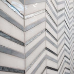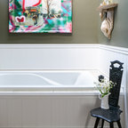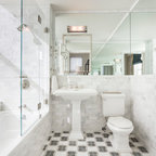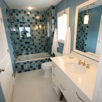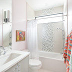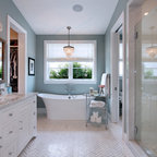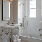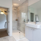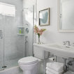 The soft green opalescent tile in the shower and on the floor creates a subtle tactile geometry, in harmony with the matte white paint used on the wall and ceiling; semi gloss is used on the trim for additional subtle contrast. The sink has clean simple lines while providing much-needed accessible storage space. A clear frameless shower enclosure allows unobstructed views of the space.