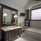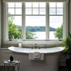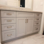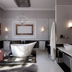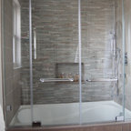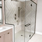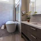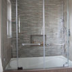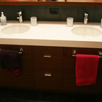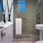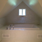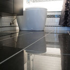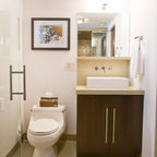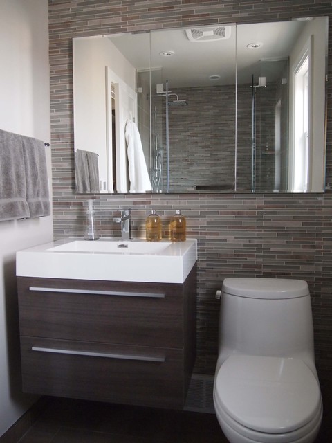 The new bathroom is modern in style and has a lot of storage for a small bathroom. The floating cabinet makes the bathroom uncluttered but provides plenty of storage as does the large mirror cabinet that is recessed into the wall, which also amplifies light coming in through the window. Both this wall and the one opposite have been done in a stone and glass mosaic that really makes the bathroom sparkle. And the one piece toilet is both energy efficient and sleek in design.