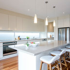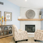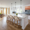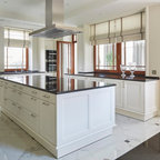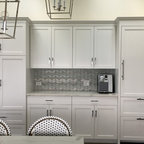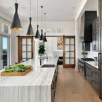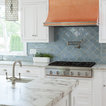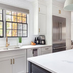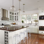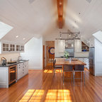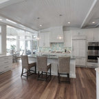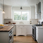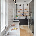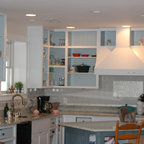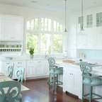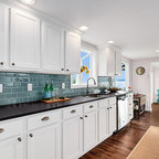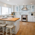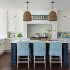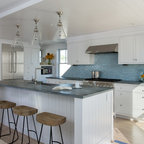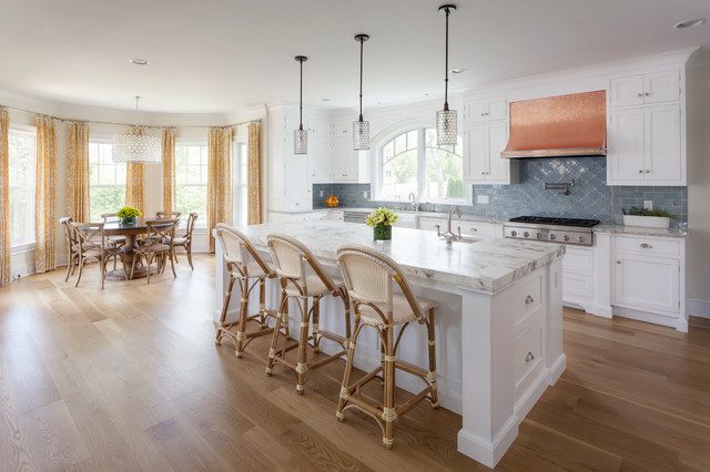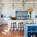 This is an example of a beach style galley kitchen/diner in Baltimore with a belfast sink, white cabinets, marble worktops, blue splashback, ceramic splashback, stainless steel appliances, medium hardwood flooring, an island and shaker cabinets. — Houzz
