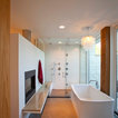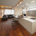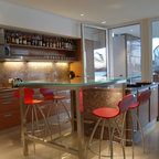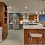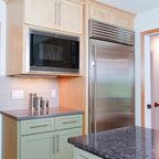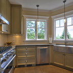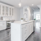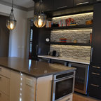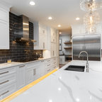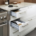 Modern galley kitchen/diner in Cincinnati with a submerged sink, flat-panel cabinets, white cabinets, stainless steel appliances and granite worktops. — Houzz