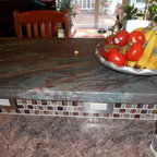 dark counter, dark floor, gray backsplash