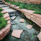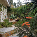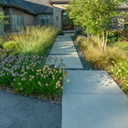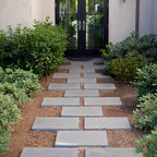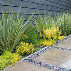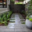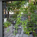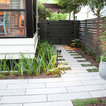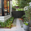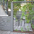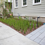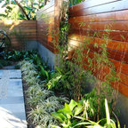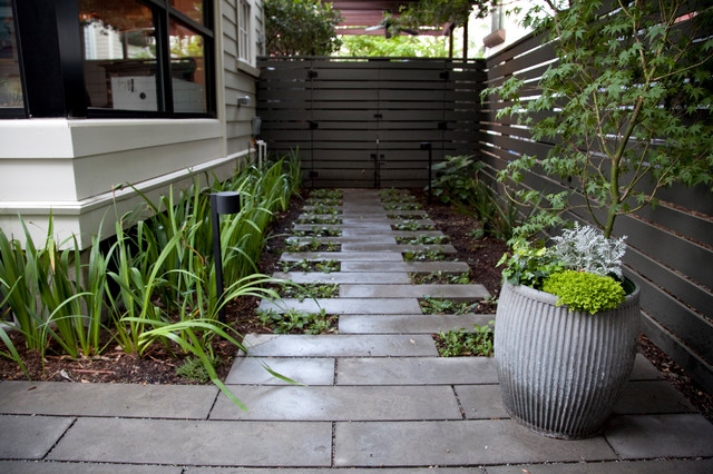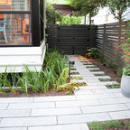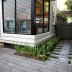 This modern garden was designed to visually expand the size of the space. Custom pavers give a simple yet elegant feel that also speak to the traditional bluestone found throughout Charleston. The pavers are set on a permeable setting bed with underdrains that direct stormwater to the rain garden in the front of the house. The native planting provide a sense of place.Located in the heart of downtown Charleston, the clients for this traditional Charleston home desired to make the most of their small lot using a modern style.. The hardscape elements of the patio and fence have clean lines and linear patte