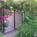 ALOE: wood posts with horizontal galvanized wires makes for a great trellis to grow a vine.