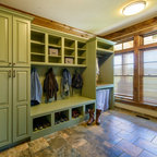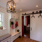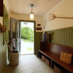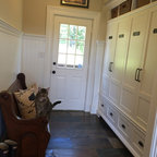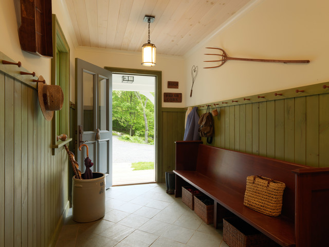 Inspiration for a medium sized rural boot room in Burlington with white walls, slate flooring, a single front door and a grey front door. — Houzz