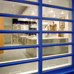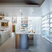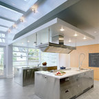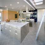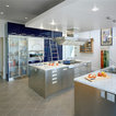 The new kitchen is light, spacious, and highly functional, with generous windows and ample counter space. The design highlights the stainless steel and glossy blue Arclinea cabinetry. Two stainless steel workstations topped with white Carrera marble float in the center of the kitchen, making a dramatic design statement. One island contains a sink, stove, and hood, and the other a larger sink and work surface. The stainless steel cabinets are visually anchored to the space by a dropped ceiling panel. The cabinets along the wall include a glossy blue Arclinea cabinet that is nine feet long and contains refrigerator units and tall storage.