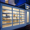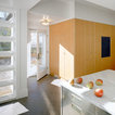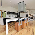 The new design peeks through horizontal windows that visually connect the interior and exterior, and a skylighted spine through the kitchen further links the house to the garden. Recessed lights and pendant lights work in combination with generous windows and doors to create a bright and user-friendly space. Other creative ideas include a blackboard embedded within a long pantry unit, and a tall six shelf bookcase (with a library ladder) that houses the homeowners’ cookbook collection.