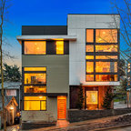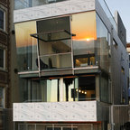 Photo of a contemporary brick exterior in Boston with three or more floors and a pitched roof. — Houzz