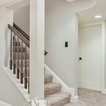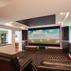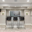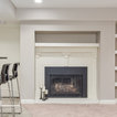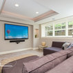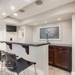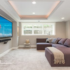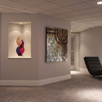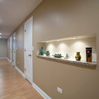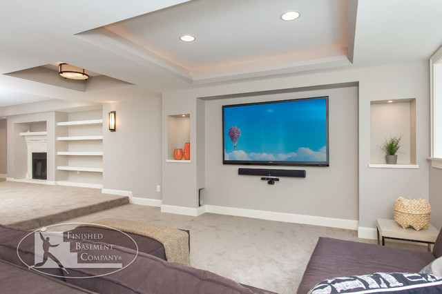 This basement feels open and inviting with a recessed ceiling and built-in wall niches and shelving. ©Finished Basement Company