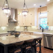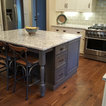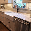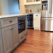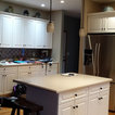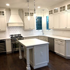 I just love this kitchen! Removed builder grade cabinets and designed a beautiful custom kitchen full of light. Installed 7" walnut flooring throughout the first floor. The Winchester tile backsplash is stunning!. Window is trimmed in cabinet material for a perfect match. Window sill is the same quartz as the counter top to flow seamlessly with the cabinets.