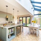 Inspiration for a large traditional l-shaped kitchen/diner in Cedar Rapids with a belfast sink, shaker cabinets, white cabinets, engineered stone countertops, green splashback, ceramic splashback, stainless steel appliances, medium hardwood flooring, an island and brown floors. — Houzz