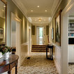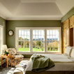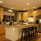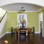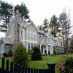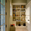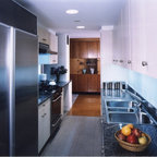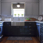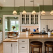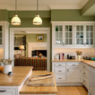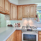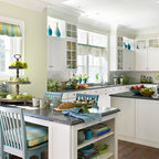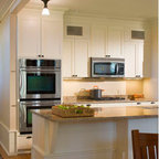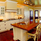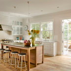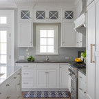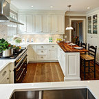 Design ideas for a traditional enclosed kitchen in New York with glass-front cabinets, wood worktops, white cabinets, a submerged sink, white splashback and white appliances. — Houzz