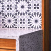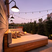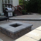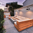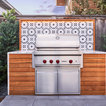 Custom outdoor kitchen with teak wood, waterfall concrete countertop and cement tiles. Bluestone pavers and Mexican Beach Pebble ground cover.