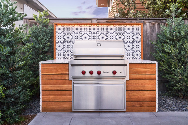 Small contemporary back patio in San Diego with an outdoor kitchen, natural stone paving and no cover. — Houzz