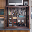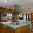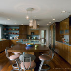 Photo of an expansive contemporary u-shaped kitchen/diner in Boston with open cabinets, dark wood cabinets, concrete worktops, stainless steel appliances, a submerged sink, dark hardwood flooring and an island. — Houzz
