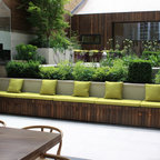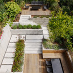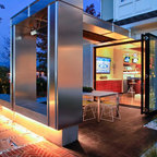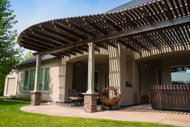 Large modern back patio in Boise with a pergola. — Houzz