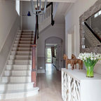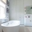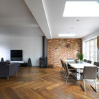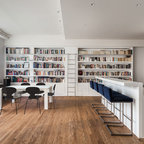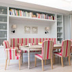 ‘This area was a blank slate when I first saw it, although the skylight was already there,’ recalls Fiona. With so much space to play with, there was a danger the room would feel too cold, so Fiona opted for colourful banquette seating to add drama to this corner of the room.‘We added the traditional-style wall unit above the seating to give a more friendly vibe,’ she explains. ‘Having books along the top makes it a really personal space, and is lovely way to express the family’s character.’ Arley Stripe fabric, GP & J Baker. Dining table, Karavan. Bespoke bookcase built by Pascal Huser.