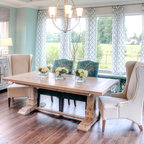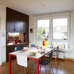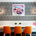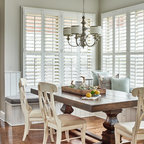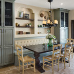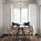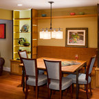 If you are thinking about putting a banquette in your kitchen, heed Susan’s advice: Ideally, you need a minimum of 27 inches of space for each person to sit comfortably. The depth of the benches should be at least 24 inches, because you will want to leave space for an angled back or upholstered seating. The table should overlap each bench by three inches or so. If you are designing a banquette in front of windows, be sure that the windows are a good 24 inches off the floor to allow for a seat height of 15 inches (not counting the height of the cushions). When it comes to upholstery, opt for something washable. Fabric-upholstered cushions are never a great idea, especially with children. Choose an upholstered banquette in leather or pleather, just like the seating you would find in a restaurant. Such material can be easily wiped clean, and you won’t have to deal with the cushions falling off the benches. Your local upholsterer should be able to help you pull this together.