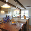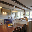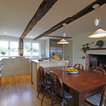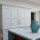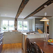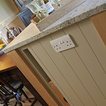 This kitchen used an in-frame design with mainly one painted colour, that being the Farrow & Ball Old White. This was accented with natural oak on the island unit pillars and on the bespoke cooker hood canopy. The Island unit features slide away tray storage on one side with tongue and grove panelling most of the way round. All of the Cupboard internals in this kitchen where clad in a Birch veneer.