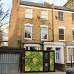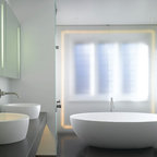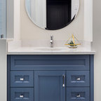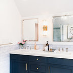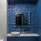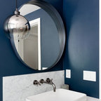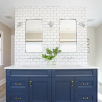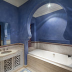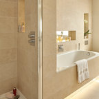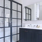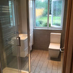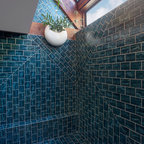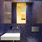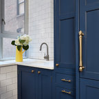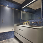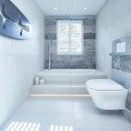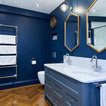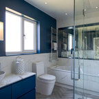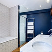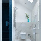 This is an example of a small contemporary family bathroom in London with freestanding cabinets, blue cabinets, a built-in bath, a walk-in shower, a wall mounted toilet, white tiles, mosaic tiles, blue walls, light hardwood flooring, a built-in sink, marble worktops, brown floors and an open shower. — Houzz
