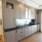 Design ideas for a medium sized classic single-wall wet bar in San Diego with a submerged sink, shaker cabinets, white cabinets, quartz worktops, grey splashback, metro tiled splashback, dark hardwood flooring and brown floors. — Houzz