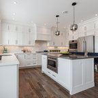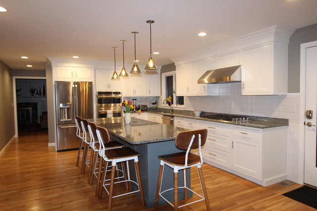Design ideas for a medium sized traditional l-shaped open plan kitchen in Boston with a submerged sink, shaker cabinets, white cabinets, granite worktops, white splashback, metro tiled splashback, stainless steel appliances, medium hardwood flooring and an island. — Houzz