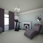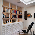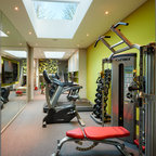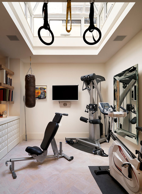 This is an example of a large victorian multi-use home gym in London with white walls and light hardwood flooring. — Houzz