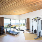 The home gym is in a smallish, semi-open-plan space next to an informal sitting room. It feels light and airy thanks to the skylight above. Russell also installed an air conditioning system to keep it feeling cool.