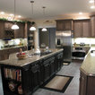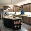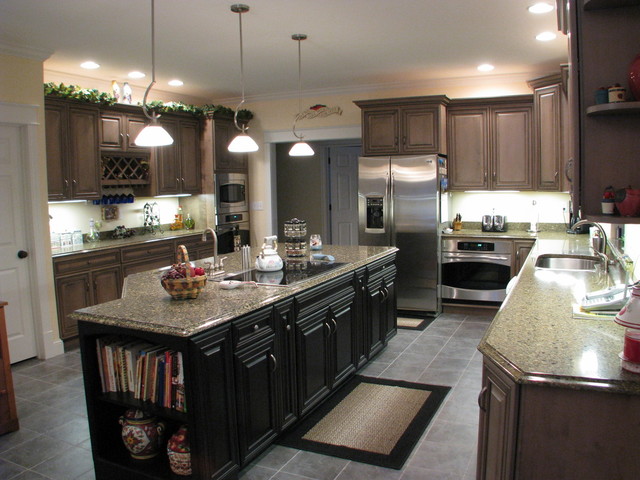 Photo of a large traditional l-shaped kitchen/diner in Burlington with a submerged sink, raised-panel cabinets, dark wood cabinets, engineered stone countertops, stainless steel appliances, porcelain flooring and an island. — Houzz